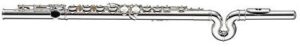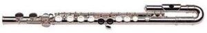 This topic is one from the archives, but with updated information! When most flute players think of curved headjoints, they think of alto and bass flutes. But did you know that curved headjoints are available on regular C flutes as well? These instruments, designed for the smaller player in mind, have waxed and waned in popularity over the years, but in my seven years with the flute shop, I have seen them make a well-deserved comeback! As a petite player who began the flute at age 9, I definitely wish that I had started out on a curved headjoint. These flutes have a U bend in the headjoint, shortening the distance from the player’s shoulders to their fingers. This creates less stretch and strain on the left hand, arm, and shoulder. The curved headjoint flute looks like this: